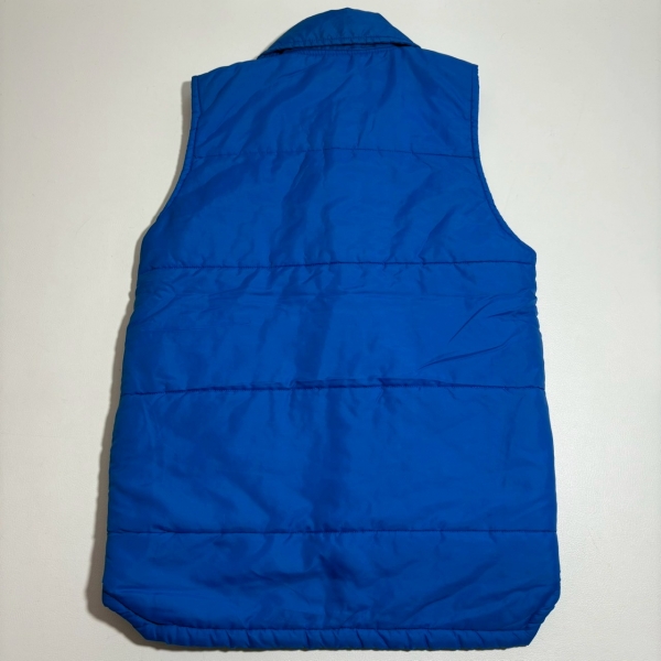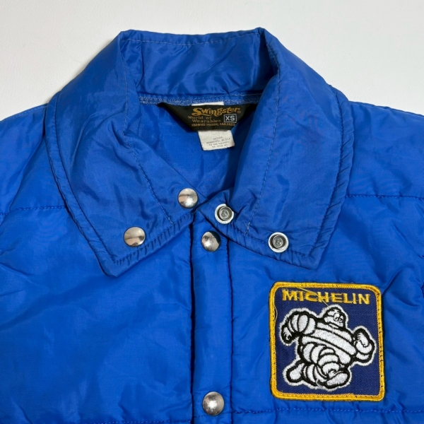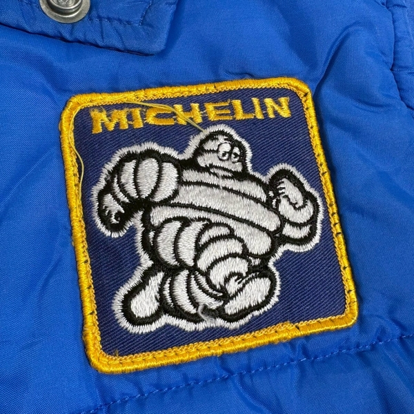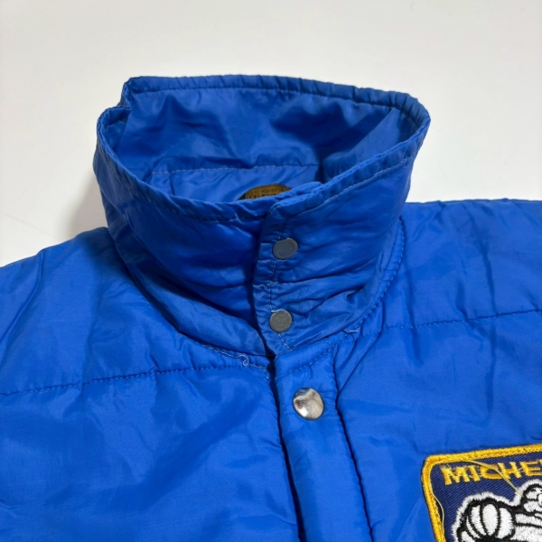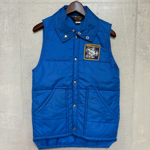 発色の良いブルーにミシュランマンのワッペンが目を惹く中綿ベスト。
